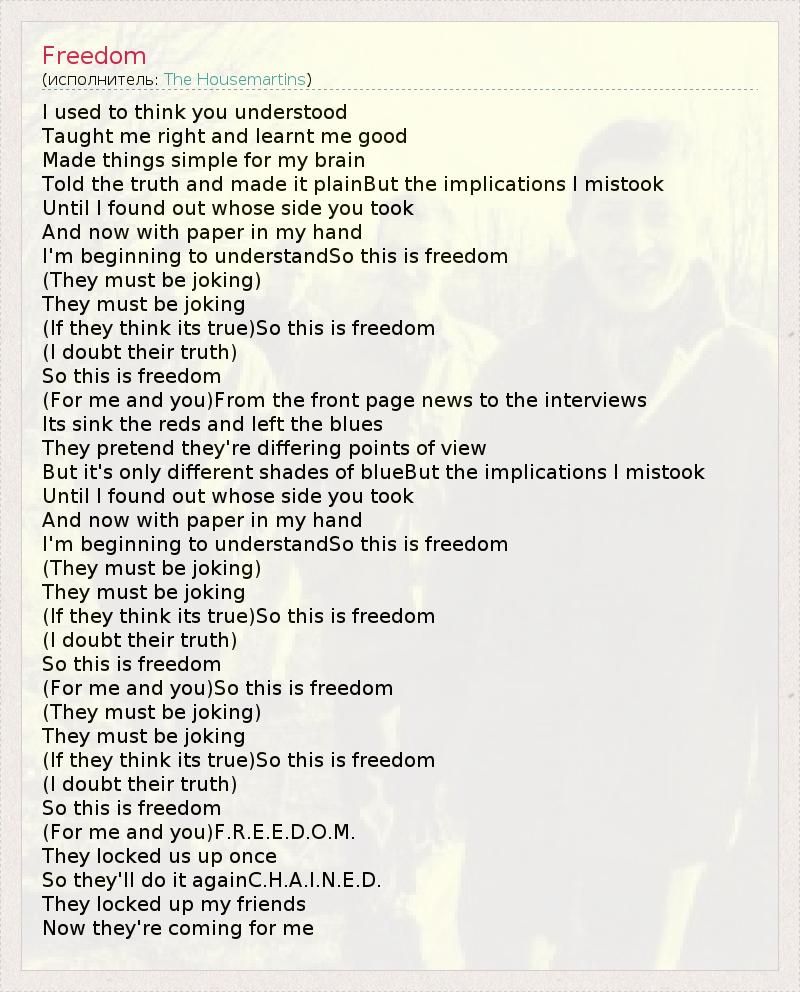 I used to think you understood Taught me right and learnt me good Made things simple for my brain Told the truth and made it plainBut the implications I mistook Until I found out whose side you took And now with paper in my hand I'm beginning to understandSo this is freedom (They must be joking) They must be joking (If they think its true)So this is freedom (I doubt their truth) So this is freedom (For me and you)From the front page news to the interviews Its sink the reds and left the blues They pretend they're differing points of view But it's only different shades of blueBut the implications I mistook Until I found out whose side you took And now with paper in my hand I'm beginning to understandSo this is freedom (They must be joking) They must be joking (If they think its true)So this is freedom (I doubt their truth) So this is freedom (For me and you)So this is freedom (They must be joking) They must be joking (If they think its true)So this is freedom (I doubt their truth) So this is freedom (For me and you)F.R.E.E.D.O.M. They locked us up once So they'll do it againC.H.A.I.N.E.D. They locked up my friends Now they're coming for me