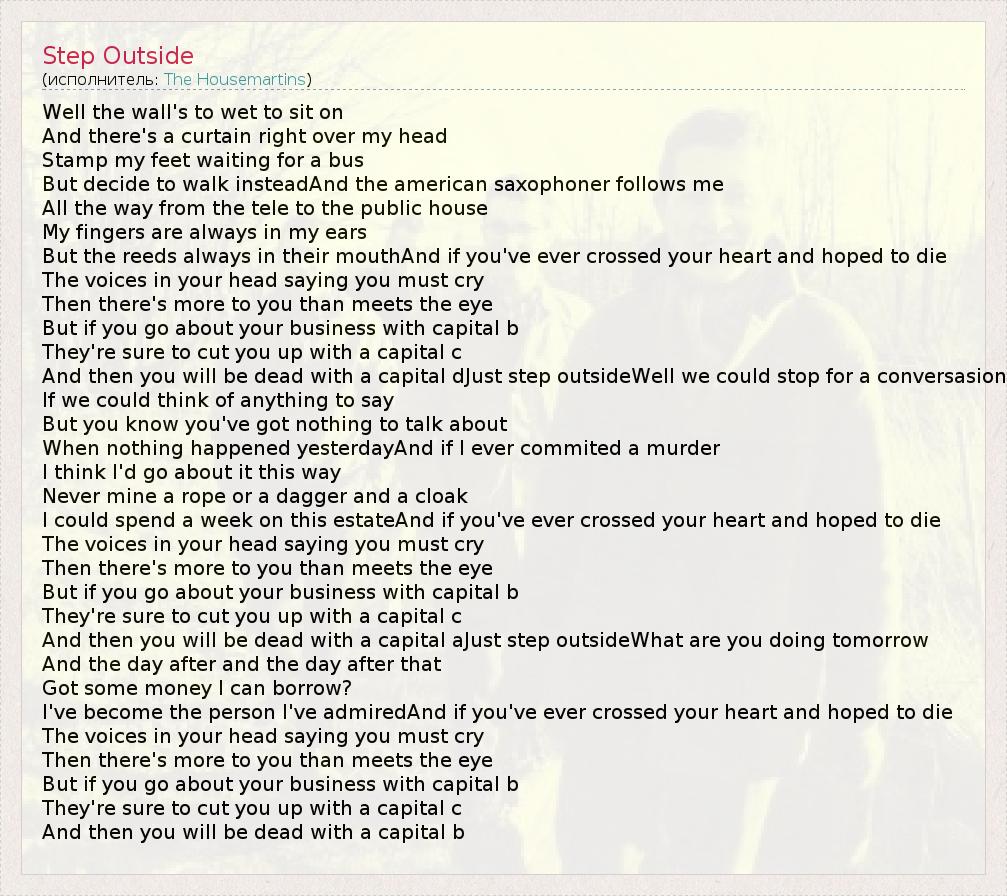 Well the wall's to wet to sit on And there's a curtain right over my head Stamp my feet waiting for a bus But decide to walk insteadAnd the american saxophoner follows me All the way from the tele to the public house My fingers are always in my ears But the reeds always in their mouthAnd if you've ever crossed your heart and hoped to die The voices in your head saying you must cry Then there's more to you than meets the eye But if you go about your business with capital b They're sure to cut you up with a capital c And then you will be dead with a capital dJust step outsideWell we could stop for a conversasion If we could think of anything to say But you know you've got nothing to talk about When nothing happened yesterdayAnd if I ever commited a murder I think I'd go about it this way Never mine a rope or a dagger and a cloak I could spend a week on this estateAnd if you've ever crossed your heart and hoped to die The voices in your head saying you must cry Then there's more to you than meets the eye But if you go about your business with capital b They're sure to cut you up with a capital c And then you will be dead with a capital aJust step outsideWhat are you doing tomorrow And the day after and the day after that Got some money I can borrow? I've become the person I've admiredAnd if you've ever crossed your heart and hoped to die The voices in your head saying you must cry Then there's more to you than meets the eye But if you go about your business with capital b They're sure to cut you up with a capital c And then you will be dead with a capital b