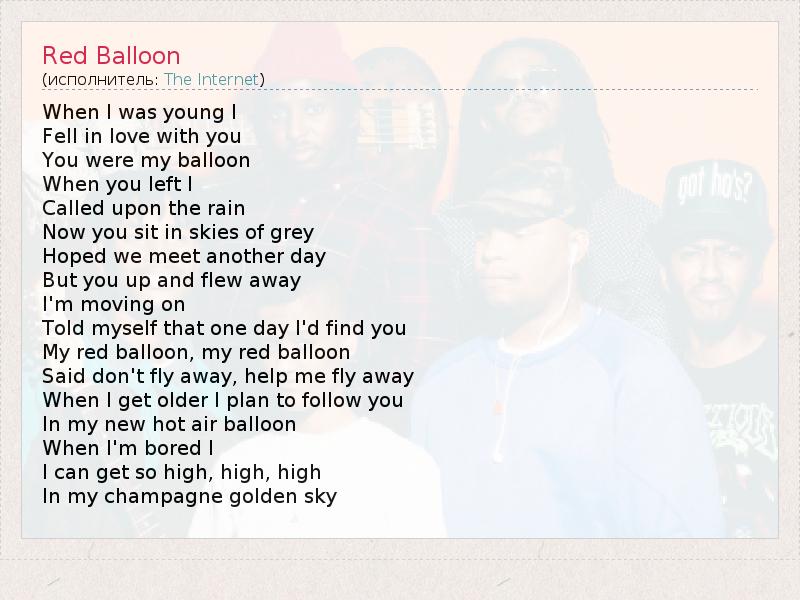 When I was young I Fell in love with you You were my balloon When you left I Called upon the rain Now you sit in skies of grey Hoped we meet another day But you up and flew away I'm moving on Told myself that one day I'd find you My red balloon, my red balloon Said don't fly away, help me fly away When I get older I plan to follow you In my new hot air balloon When I'm bored I I can get so high, high, high In my champagne golden sky