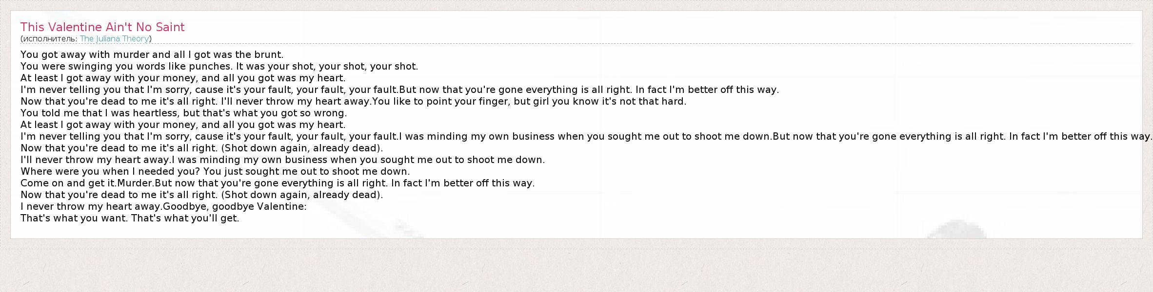You got away with murder and all I got was the brunt. You were swinging you words like punches. It was your shot, your shot, your shot. At least I got away with your money, and all you got was my heart. I'm never telling you that I'm sorry, cause it's your fault, your fault, your fault.But now that you're gone everything is all right. In fact I'm better off this way. Now that you're dead to me it's all right. I'll never throw my heart away.You like to point your finger, but girl you know it's not that hard. You told me that I was heartless, but that's what you got so wrong. At least I got away with your money, and all you got was my heart. I'm never telling you that I'm sorry, cause it's your fault, your fault, your fault.I was minding my own business when you sought me out to shoot me down.But now that you're gone everything is all right. In fact I'm better off this way. Now that you're dead to me it's all right. (Shot down again, already dead). I'll never throw my heart away.I was minding my own business when you sought me out to shoot me down. Where were you when I needed you? You just sought me out to shoot me down. Come on and get it.Murder.But now that you're gone everything is all right. In fact I'm better off this way. Now that you're dead to me it's all right. (Shot down again, already dead). I never throw my heart away.Goodbye, goodbye Valentine: That's what you want. That's what you'll get.