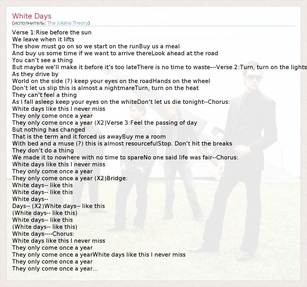 Verse 1:Rise before the sun We leave when it lifts The show must go on so we start on the runBuy us a meal And buy us some time if we want to arrive thereLook ahead at the road You can't see a thing But maybe we'll make it before it's too lateThere is no time to waste---Verse 2:Turn, turn on the lights As they drive by World on the side (?) keep your eyes on the roadHands on the wheel Don't let us slip this is almost a nightmareTurn, turn on the heat They can't feel a thing As I fall asleep keep your eyes on the whiteDon't let us die tonight--Chorus: White days like this I never miss They only come once a year They only come once a year (X2)Verse 3:Feel the passing of day But nothing has changed That is the term and it forced us awayBuy me a room With bed and a muse (?) this is almost resourcefulStop. Don't hit the breaks They don't do a thing We made it to nowhere with no time to spareNo one said life was fair--Chorus: White days like this I never miss They only come once a year They only come once a year (X2)Bridge: White days-- like this White days-- like this White days-- Days-- (X2)White days-- like this (White days-- like this) White days-- like this (White days-- like this) White days----Chorus: White days like this I never miss They only come once a year They only come once a yearWhite days like this I never miss They only come once a year They only come once a year...