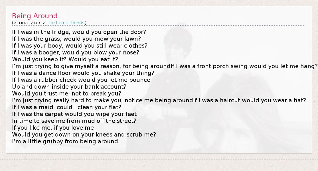 А как ты думаешь, о чем песня "Being Around" ?