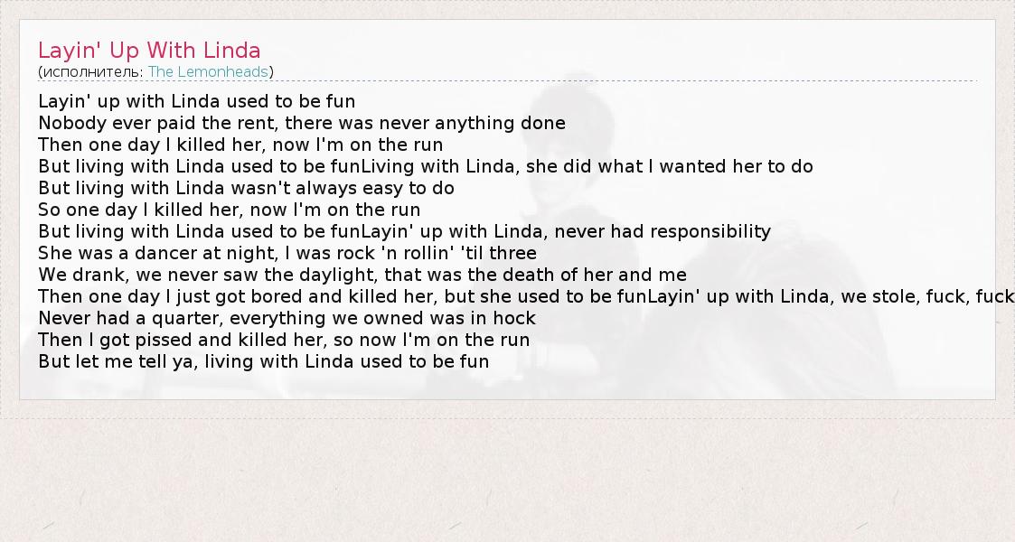 Layin' up with Linda used to be fun Nobody ever paid the rent, there was never anything done Then one day I killed her, now I'm on the run But living with Linda used to be funLiving with Linda, she did what I wanted her to do But living with Linda wasn't always easy to do So one day I killed her, now I'm on the run But living with Linda used to be funLayin' up with Linda, never had responsibility She was a dancer at night, I was rock 'n rollin' 'til three We drank, we never saw the daylight, that was the death of her and me Then one day I just got bored and killed her, but she used to be funLayin' up with Linda, we stole, fuck, fuck Never had a quarter, everything we owned was in hock Then I got pissed and killed her, so now I'm on the run But let me tell ya, living with Linda used to be fun