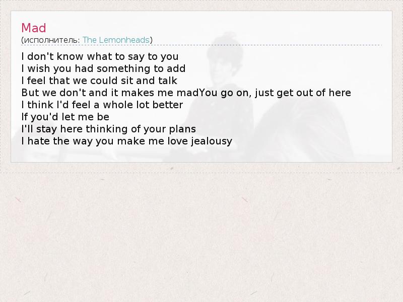 I don't know what to say to you I wish you had something to add I feel that we could sit and talk But we don't and it makes me madYou go on, just get out of here I think I'd feel a whole lot better If you'd let me be I'll stay here thinking of your plans I hate the way you make me love jealousy