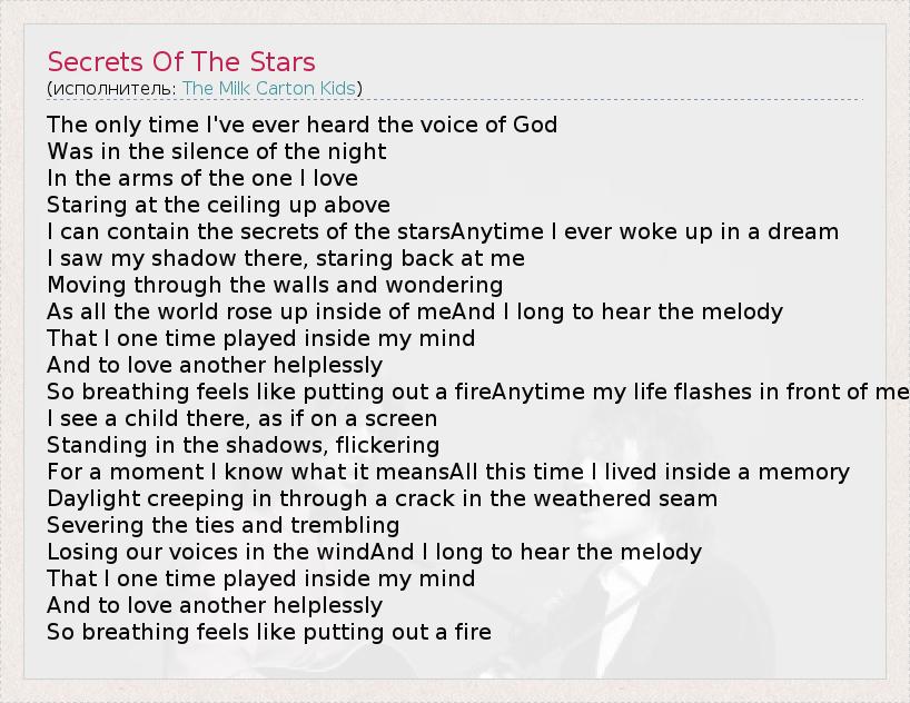 А как ты думаешь, о чем песня "Secrets Of The Stars" ?