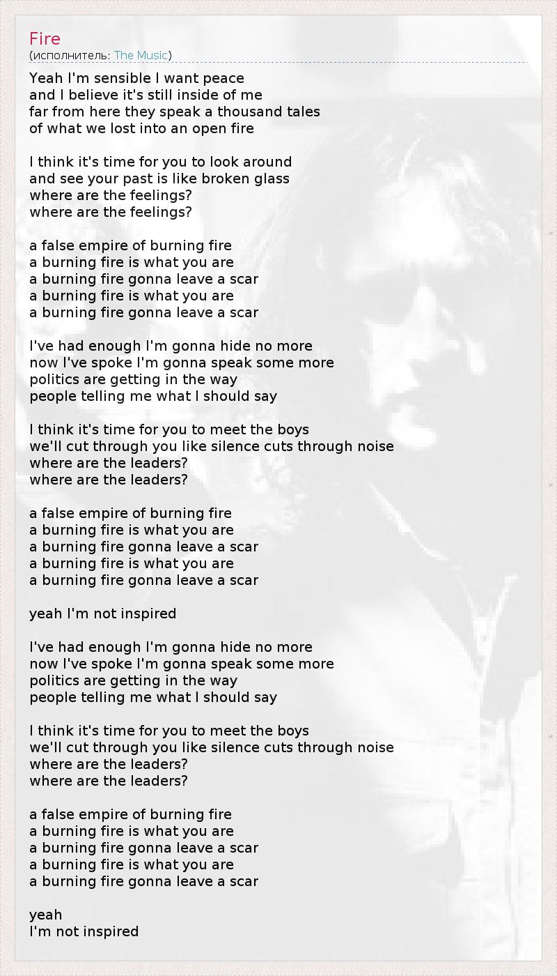 Yeah I'm sensible I want peace and I believe it's still inside of me far from here they speak a thousand tales of what we lost into an open fire I think it's time for you to look around and see your past is like broken glass where are the feelings? where are the feelings? a false empire of burning fire a burning fire is what you are a burning fire gonna leave a scar a burning fire is what you are a burning fire gonna leave a scar I've had enough I'm gonna hide no more now I've spoke I'm gonna speak some more politics are getting in the way people telling me what I should say I think it's time for you to meet the boys we'll cut through you like silence cuts through noise where are the leaders? where are the leaders? a false empire of burning fire a burning fire is what you are a burning fire gonna leave a scar a burning fire is what you are a burning fire gonna leave a scar yeah I'm not inspired I've had enough I'm gonna hide no more now I've spoke I'm gonna speak some more politics are getting in the way people telling me what I should say I think it's time for you to meet the boys we'll cut through you like silence cuts through noise where are the leaders? where are the leaders? a false empire of burning fire a burning fire is what you are a burning fire gonna leave a scar a burning fire is what you are a burning fire gonna leave a scar yeah I'm not inspired