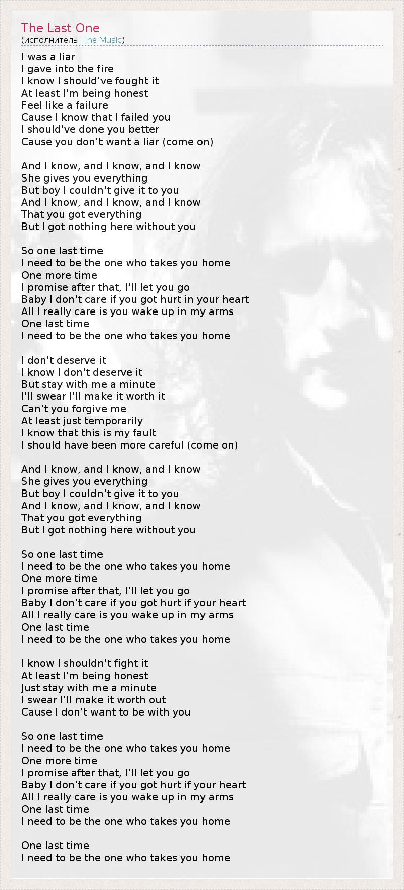 I was a liar I gave into the fire I know I should've fought it At least I'm being honest Feel like a failure Cause I know that I failed you I should've done you better Cause you don't want a liar (come on) And I know, and I know, and I know She gives you everything But boy I couldn't give it to you And I know, and I know, and I know That you got everything But I got nothing here without you So one last time I need to be the one who takes you home One more time I promise after that, I'll let you go Baby I don't care if you got hurt in your heart All I really care is you wake up in my arms One last time I need to be the one who takes you home I don't deserve it I know I don't deserve it But stay with me a minute I'll swear I'll make it worth it Can't you forgive me At least just temporarily I know that this is my fault I should have been more careful (come on) And I know, and I know, and I know She gives you everything But boy I couldn't give it to you And I know, and I know, and I know That you got everything But I got nothing here without you So one last time I need to be the one who takes you home One more time I promise after that, I'll let you go Baby I don't care if you got hurt if your heart All I really care is you wake up in my arms One last time I need to be the one who takes you home I know I shouldn't fight it At least I'm being honest Just stay with me a minute I swear I'll make it worth out Cause I don't want to be with you So one last time I need to be the one who takes you home One more time I promise after that, I'll let you go Baby I don't care if you got hurt if your heart All I really care is you wake up in my arms One last time I need to be the one who takes you home One last time I need to be the one who takes you home