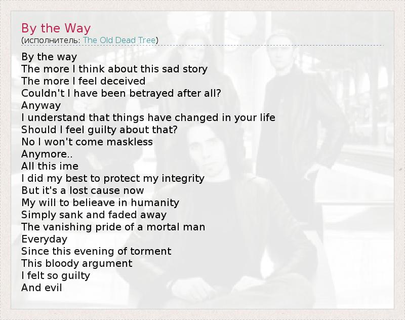Это интересно:О группе The Dead Old Tree известно немногое. Возникла в 1997 году; записала одно демо и два альбома. Запись 2003 года The Nameless Disease посвящена Фредерику Гильмо — барабанщику, покончившему жизнь самоубийством."The Old Dead Tree больше нет. Я надеялся, что мне никогда не придется писать этих слов, но ничто не вечно. Последние несколько месяцев в группе стали нарастать некоторые разногласия по поводу обязательств... продолжение