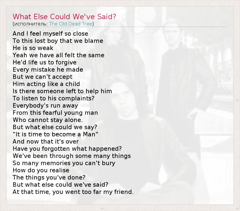ГлавнаяИсполнителиThe Old Dead TreeWhat Else Could We've Said?