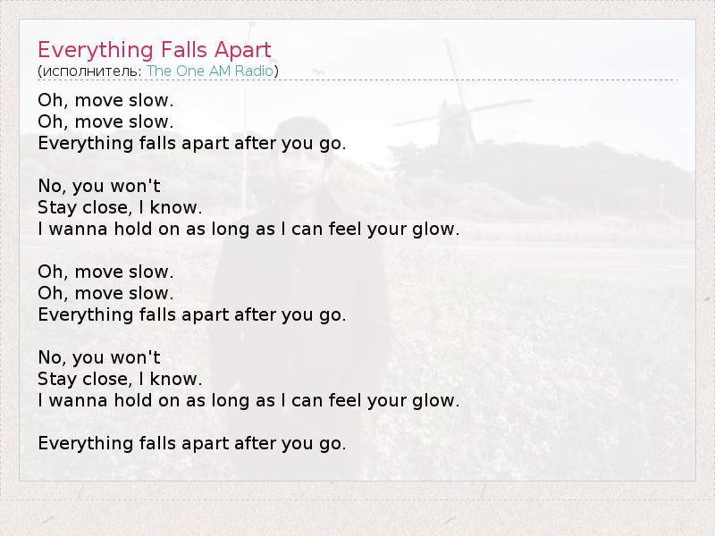 Oh, move slow. Oh, move slow. Everything falls apart after you go. No, you won't Stay close, I know. I wanna hold on as long as I can feel your glow. Oh, move slow. Oh, move slow. Everything falls apart after you go. No, you won't Stay close, I know. I wanna hold on as long as I can feel your glow. Everything falls apart after you go.