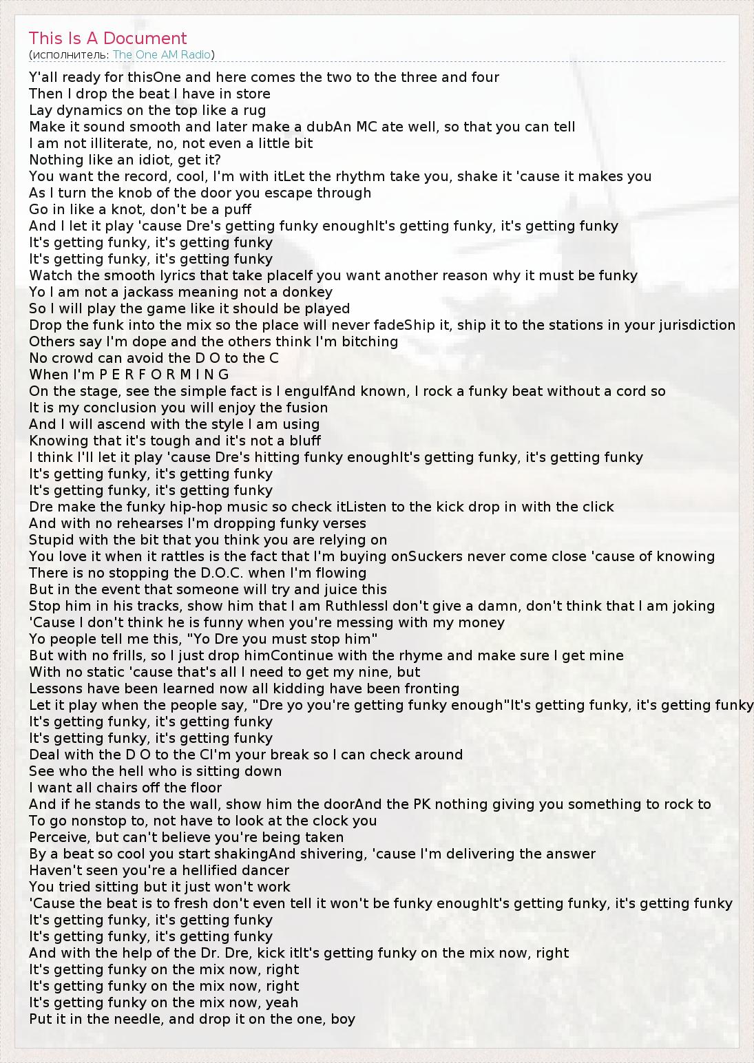 Y'all ready for thisOne and here comes the two to the three and four Then I drop the beat I have in store Lay dynamics on the top like a rug Make it sound smooth and later make a dubAn MC ate well, so that you can tell I am not illiterate, no, not even a little bit Nothing like an idiot, get it? You want the record, cool, I'm with itLet the rhythm take you, shake it 'cause it makes you As I turn the knob of the door you escape through Go in like a knot, don't be a puff And I let it play 'cause Dre's getting funky enoughIt's getting funky, it's getting funky It's getting funky, it's getting funky It's getting funky, it's getting funky Watch the smooth lyrics that take placeIf you want another reason why it must be funky Yo I am not a jackass meaning not a donkey So I will play the game like it should be played Drop the funk into the mix so the place will never fadeShip it, ship it to the stations in your jurisdiction Others say I'm dope and the others think I'm bitching No crowd can avoid the D O to the C When I'm P E R F O R M I N G On the stage, see the simple fact is I engulfAnd known, I rock a funky beat without a cord so It is my conclusion you will enjoy the fusion And I will ascend with the style I am using Knowing that it's tough and it's not a bluff I think I'll let it play 'cause Dre's hitting funky enoughIt's getting funky, it's getting funky It's getting funky, it's getting funky It's getting funky, it's getting funky Dre make the funky hip-hop music so check itListen to the kick drop in with the click And with no rehearses I'm dropping funky verses Stupid with the bit that you think you are relying on You love it when it rattles is the fact that I'm buying onSuckers never come close 'cause of knowing There is no stopping the D.O.C. when I'm flowing But in the event that someone will try and juice this Stop him in his tracks, show him that I am RuthlessI don't give a damn, don't think that I am joking 'Cause I don't think he is funny when you're messing with my money Yo people tell me this, "Yo Dre you must stop him" But with no frills, so I just drop himContinue with the rhyme and make sure I get mine With no static 'cause that's all I need to get my nine, but Lessons have been learned now all kidding have been fronting Let it play when the people say, "Dre yo you're getting funky enough"It's getting funky, it's getting funky It's getting funky, it's getting funky It's getting funky, it's getting funky Deal with the D O to the CI'm your break so I can check around See who the hell who is sitting down I want all chairs off the floor And if he stands to the wall, show him the doorAnd the PK nothing giving you something to rock to To go nonstop to, not have to look at the clock you Perceive, but can't believe you're being taken By a beat so cool you start shakingAnd shivering, 'cause I'm delivering the answer Haven't seen you're a hellified dancer You tried sitting but it just won't work 'Cause the beat is to fresh don't even tell it won't be funky enoughIt's getting funky, it's getting funky It's getting funky, it's getting funky It's getting funky, it's getting funky And with the help of the Dr. Dre, kick itIt's getting funky on the mix now, right It's getting funky on the mix now, right It's getting funky on the mix now, right It's getting funky on the mix now, yeah Put it in the needle, and drop it on the one, boy