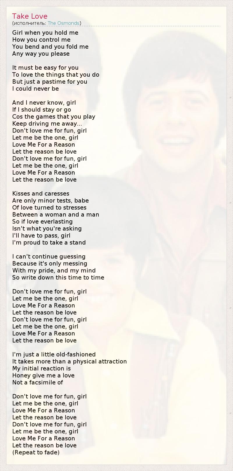Girl when you hold me How you control me You bend and you fold me Any way you please It must be easy for you To love the things that you do But just a pastime for you I could never be And I never know, girl If I should stay or go Cos the games that you play Keep driving me away... Don't love me for fun, girl Let me be the one, girl Love Me For a Reason Let the reason be love Don't love me for fun, girl Let me be the one, girl Love Me For a Reason Let the reason be love Kisses and caresses Are only minor tests, babe Of love turned to stresses Between a woman and a man So if love everlasting Isn't what you're asking I'll have to pass, girl I'm proud to take a stand I can't continue guessing Because it's only messing With my pride, and my mind So write down this time to time Don't love me for fun, girl Let me be the one, girl Love Me For a Reason Let the reason be love Don't love me for fun, girl Let me be the one, girl Love Me For a Reason Let the reason be love I'm just a little old-fashioned It takes more than a physical attraction My initial reaction is Honey give me a love Not a facsimile of Don't love me for fun, girl Let me be the one, girl Love Me For a Reason Let the reason be love Don't love me for fun, girl Let me be the one, girl Love Me For a Reason Let the reason be love (Repeat to fade)