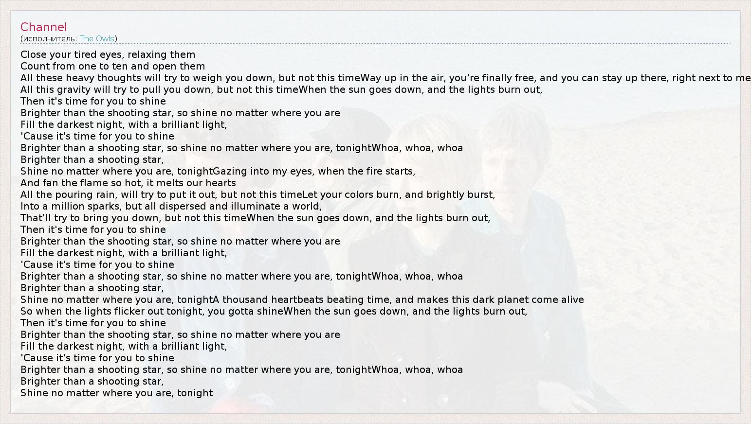 Close your tired eyes, relaxing them Count from one to ten and open them All these heavy thoughts will try to weigh you down, but not this timeWay up in the air, you're finally free, and you can stay up there, right next to me All this gravity will try to pull you down, but not this timeWhen the sun goes down, and the lights burn out, Then it's time for you to shine Brighter than the shooting star, so shine no matter where you are Fill the darkest night, with a brilliant light, 'Cause it's time for you to shine Brighter than a shooting star, so shine no matter where you are, tonightWhoa, whoa, whoa Brighter than a shooting star, Shine no matter where you are, tonightGazing into my eyes, when the fire starts, And fan the flame so hot, it melts our hearts All the pouring rain, will try to put it out, but not this timeLet your colors burn, and brightly burst, Into a million sparks, but all dispersed and illuminate a world, That'll try to bring you down, but not this timeWhen the sun goes down, and the lights burn out, Then it's time for you to shine Brighter than the shooting star, so shine no matter where you are Fill the darkest night, with a brilliant light, 'Cause it's time for you to shine Brighter than a shooting star, so shine no matter where you are, tonightWhoa, whoa, whoa Brighter than a shooting star, Shine no matter where you are, tonightA thousand heartbeats beating time, and makes this dark planet come alive So when the lights flicker out tonight, you gotta shineWhen the sun goes down, and the lights burn out, Then it's time for you to shine Brighter than the shooting star, so shine no matter where you are Fill the darkest night, with a brilliant light, 'Cause it's time for you to shine Brighter than a shooting star, so shine no matter where you are, tonightWhoa, whoa, whoa Brighter than a shooting star, Shine no matter where you are, tonight