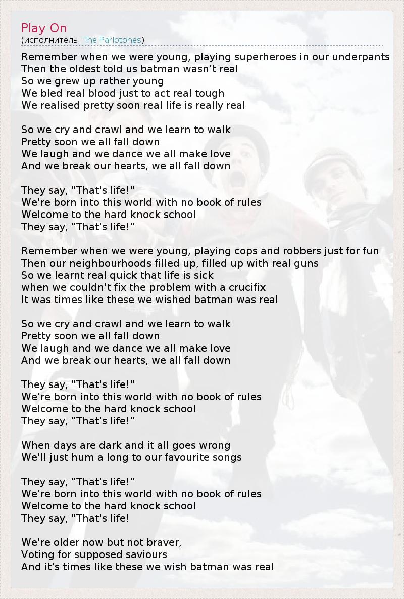 Remember when we were young, playing superheroes in our underpants Then the oldest told us batman wasn't real So we grew up rather young We bled real blood just to act real tough We realised pretty soon real life is really real So we cry and crawl and we learn to walk Pretty soon we all fall down We laugh and we dance we all make love And we break our hearts, we all fall down They say, "That's life!" We're born into this world with no book of rules Welcome to the hard knock school They say, "That's life!" Remember when we were young, playing cops and robbers just for fun Then our neighbourhoods filled up, filled up with real guns So we learnt real quick that life is sick when we couldn't fix the problem with a crucifix It was times like these we wished batman was real So we cry and crawl and we learn to walk Pretty soon we all fall down We laugh and we dance we all make love And we break our hearts, we all fall down They say, "That's life!" We're born into this world with no book of rules Welcome to the hard knock school They say, "That's life!" When days are dark and it all goes wrong We'll just hum a long to our favourite songs They say, "That's life!" We're born into this world with no book of rules Welcome to the hard knock school They say, "That's life! We're older now but not braver, Voting for supposed saviours And it's times like these we wish batman was real