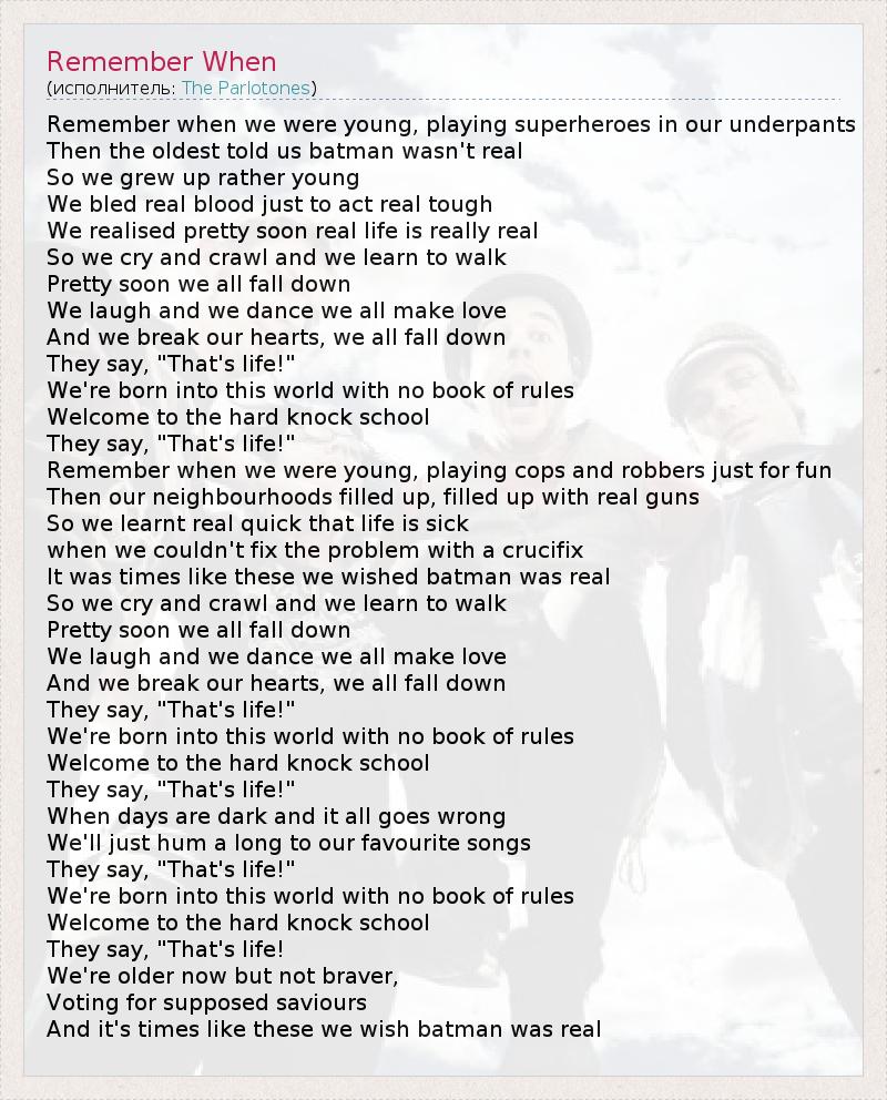 Remember when we were young, playing superheroes in our underpants Then the oldest told us batman wasn't real So we grew up rather young We bled real blood just to act real tough We realised pretty soon real life is really real So we cry and crawl and we learn to walk Pretty soon we all fall down We laugh and we dance we all make love And we break our hearts, we all fall down They say, "That's life!" We're born into this world with no book of rules Welcome to the hard knock school They say, "That's life!" Remember when we were young, playing cops and robbers just for fun Then our neighbourhoods filled up, filled up with real guns So we learnt real quick that life is sick when we couldn't fix the problem with a crucifix It was times like these we wished batman was real So we cry and crawl and we learn to walk Pretty soon we all fall down We laugh and we dance we all make love And we break our hearts, we all fall down They say, "That's life!" We're born into this world with no book of rules Welcome to the hard knock school They say, "That's life!" When days are dark and it all goes wrong We'll just hum a long to our favourite songs They say, "That's life!" We're born into this world with no book of rules Welcome to the hard knock school They say, "That's life! We're older now but not braver, Voting for supposed saviours And it's times like these we wish batman was real