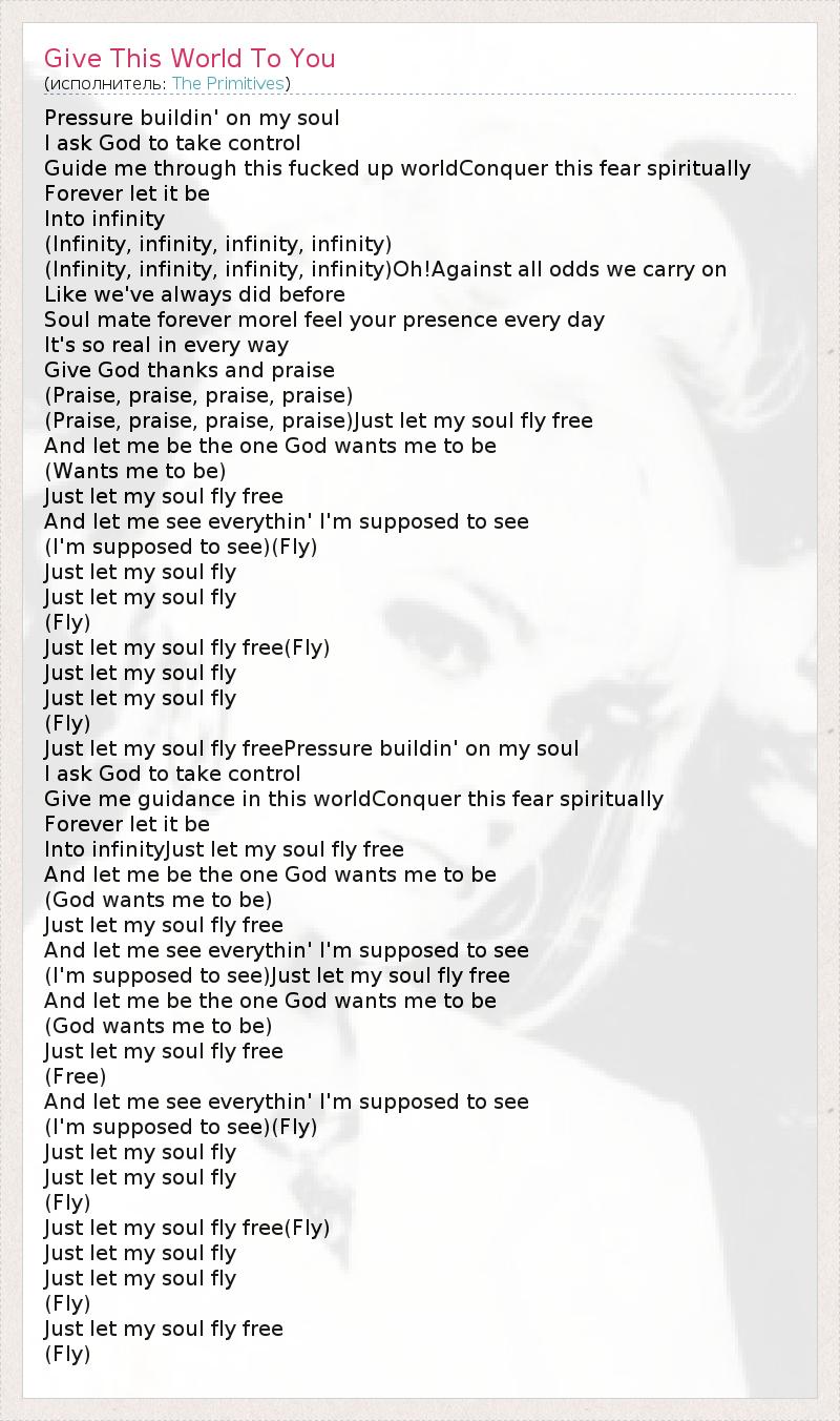 Pressure buildin' on my soul I ask God to take control Guide me through this fucked up worldConquer this fear spiritually Forever let it be Into infinity (Infinity, infinity, infinity, infinity) (Infinity, infinity, infinity, infinity)Oh!Against all odds we carry on Like we've always did before Soul mate forever moreI feel your presence every day It's so real in every way Give God thanks and praise (Praise, praise, praise, praise) (Praise, praise, praise, praise)Just let my soul fly free And let me be the one God wants me to be (Wants me to be) Just let my soul fly free And let me see everythin' I'm supposed to see (I'm supposed to see)(Fly) Just let my soul fly Just let my soul fly (Fly) Just let my soul fly free(Fly) Just let my soul fly Just let my soul fly (Fly) Just let my soul fly freePressure buildin' on my soul I ask God to take control Give me guidance in this worldConquer this fear spiritually Forever let it be Into infinityJust let my soul fly free And let me be the one God wants me to be (God wants me to be) Just let my soul fly free And let me see everythin' I'm supposed to see (I'm supposed to see)Just let my soul fly free And let me be the one God wants me to be (God wants me to be) Just let my soul fly free (Free) And let me see everythin' I'm supposed to see (I'm supposed to see)(Fly) Just let my soul fly Just let my soul fly (Fly) Just let my soul fly free(Fly) Just let my soul fly Just let my soul fly (Fly) Just let my soul fly free (Fly)
