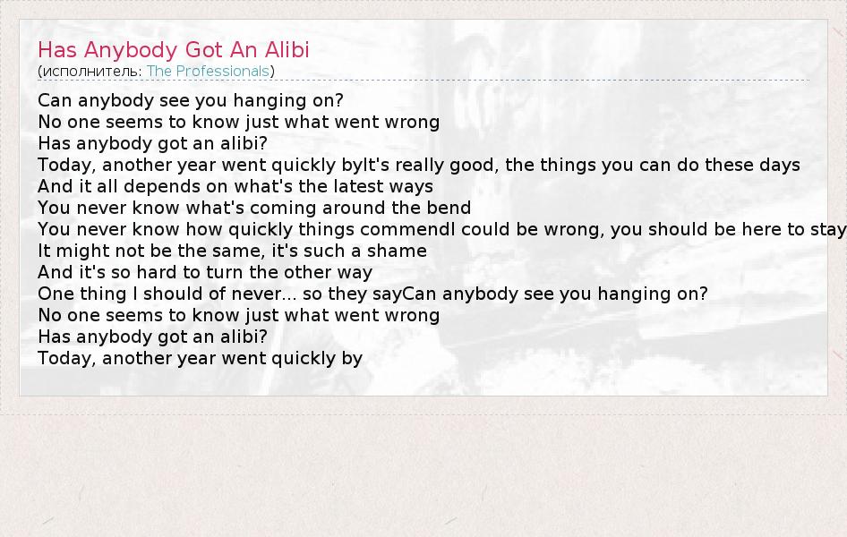 А как ты думаешь, о чем песня "Has Anybody Got An Alibi" ?
