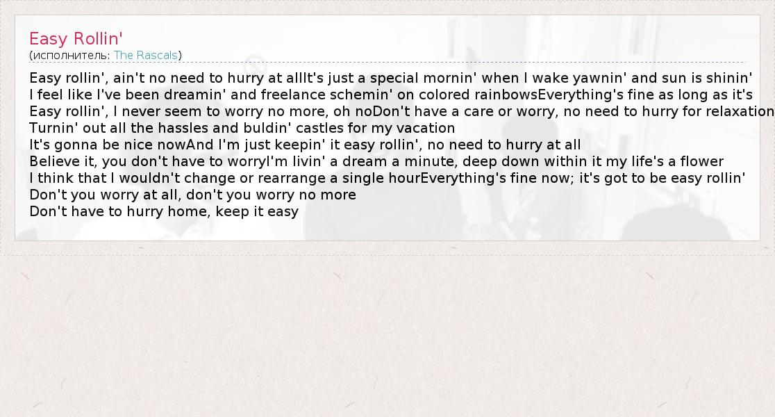 Easy rollin', ain't no need to hurry at allIt's just a special mornin' when I wake yawnin' and sun is shinin' I feel like I've been dreamin' and freelance schemin' on colored rainbowsEverything's fine as long as it's Easy rollin', I never seem to worry no more, oh noDon't have a care or worry, no need to hurry for relaxation Turnin' out all the hassles and buldin' castles for my vacation It's gonna be nice nowAnd I'm just keepin' it easy rollin', no need to hurry at all Believe it, you don't have to worryI'm livin' a dream a minute, deep down within it my life's a flower I think that I wouldn't change or rearrange a single hourEverything's fine now; it's got to be easy rollin' Don't you worry at all, don't you worry no more Don't have to hurry home, keep it easy