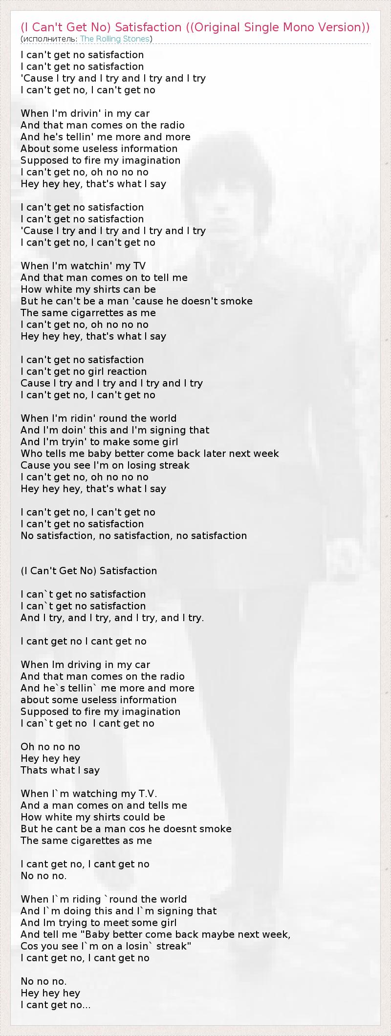 А как ты думаешь, о чем песня "(I Can't Get No) Satisfaction ((Original Single Mono Version))" ?