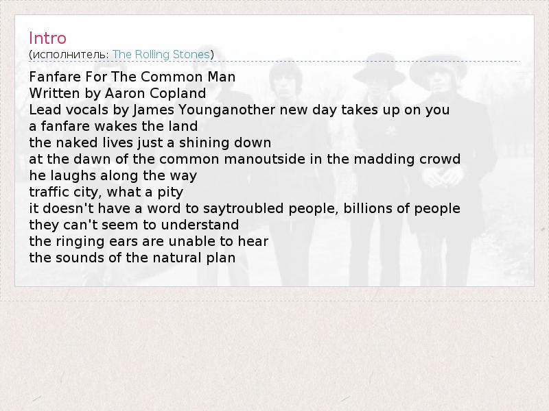 Это интересно:The Rolling Stones (англ. Роллинг Стоунз, «Перекати-поле») — британская рок-группа, образовавшаяся в 1962 году и многие годы соперничавшая по популярности с The Beatles. Rolling Stones, ставшие важной частью Британского вторжения, считаются одной из самых влиятельных и успешных групп в истории рока. Музыкальный стиль Rolling Stones, формировавшийся под влиянием Роберта Джонсона (Robert... продолжение