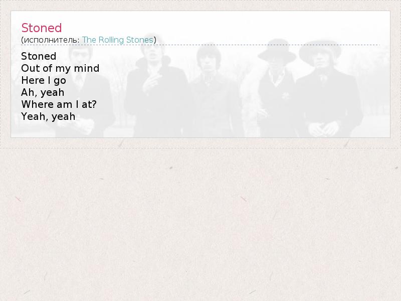 Это интересно:The Rolling Stones (англ. Роллинг Стоунз, «Перекати-поле») — британская рок-группа, образовавшаяся в 1962 году и многие годы соперничавшая по популярности с The Beatles. Rolling Stones, ставшие важной частью Британского вторжения, считаются одной из самых влиятельных и успешных групп в истории рока. Музыкальный стиль Rolling Stones, формировавшийся под влиянием Роберта Джонсона (Robert... продолжение
