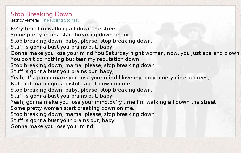 Ev'ry time I'm walking all down the street Some pretty mama start breaking down on me. Stop breaking down, baby, please, stop breaking down. Stuff is gonna bust you brains out, baby, Gonna make you lose your mind.You Saturday night women, now, you just ape and clown, You don't do nothing but tear my reputation down. Stop breaking down, mama, please, stop breaking down. Stuff is gonna bust you brains out, baby, Yeah, it's gonna make you lose your mind.I love my baby ninety nine degrees, But that mama got a pistol, laid it down on me. Stop breaking down, baby, please, stop breaking down. Stuff is gonna bust you brains out, baby, Yeah, gonna make you lose your mind.Ev'ry time I'm walking all down the street Some pretty woman start breaking down on me. Stop breaking down, mama, please, stop breaking down. Stuff is gonna bust your brains out, baby, Gonna make you lose your mind.