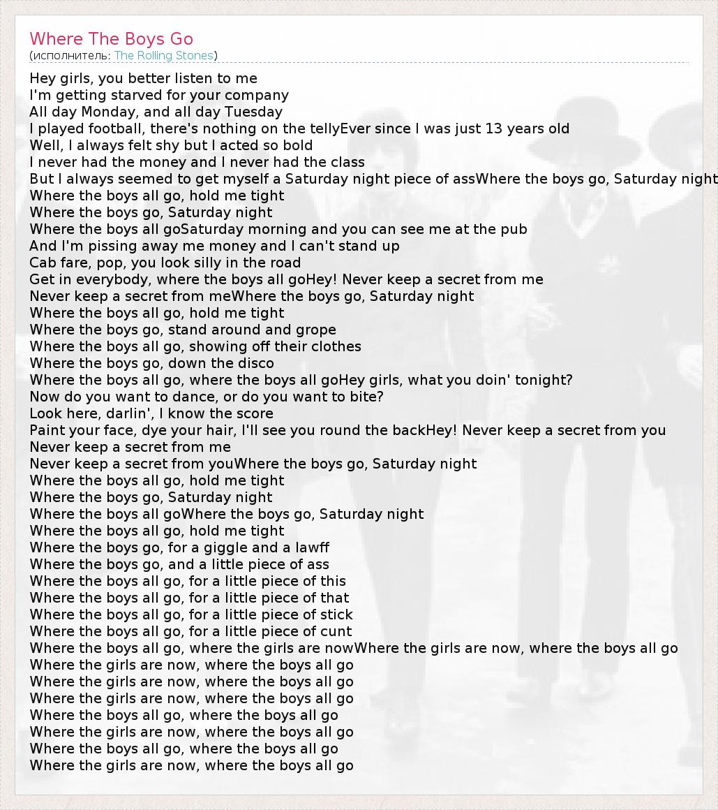 Hey girls, you better listen to me I'm getting starved for your company All day Monday, and all day Tuesday I played football, there's nothing on the tellyEver since I was just 13 years old Well, I always felt shy but I acted so bold I never had the money and I never had the class But I always seemed to get myself a Saturday night piece of assWhere the boys go, Saturday night Where the boys all go, hold me tight Where the boys go, Saturday night Where the boys all goSaturday morning and you can see me at the pub And I'm pissing away me money and I can't stand up Cab fare, pop, you look silly in the road Get in everybody, where the boys all goHey! Never keep a secret from me Never keep a secret from meWhere the boys go, Saturday night Where the boys all go, hold me tight Where the boys go, stand around and grope Where the boys all go, showing off their clothes Where the boys go, down the disco Where the boys all go, where the boys all goHey girls, what you doin' tonight? Now do you want to dance, or do you want to bite? Look here, darlin', I know the score Paint your face, dye your hair, I'll see you round the backHey! Never keep a secret from you Never keep a secret from me Never keep a secret from youWhere the boys go, Saturday night Where the boys all go, hold me tight Where the boys go, Saturday night Where the boys all goWhere the boys go, Saturday night Where the boys all go, hold me tight Where the boys go, for a giggle and a lawff Where the boys go, and a little piece of ass Where the boys all go, for a little piece of this Where the boys all go, for a little piece of that Where the boys all go, for a little piece of stick Where the boys all go, for a little piece of cunt Where the boys all go, where the girls are nowWhere the girls are now, where the boys all go Where the girls are now, where the boys all go Where the girls are now, where the boys all go Where the girls are now, where the boys all go Where the boys all go, where the boys all go Where the girls are now, where the boys all go Where the boys all go, where the boys all go Where the girls are now, where the boys all go