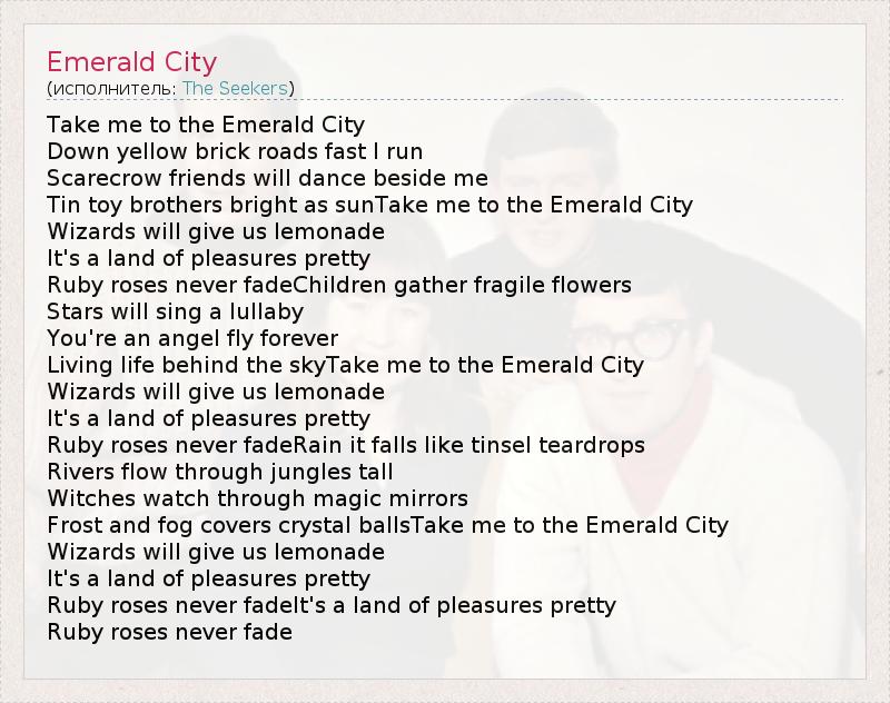 Take me to the Emerald City Down yellow brick roads fast I run Scarecrow friends will dance beside me Tin toy brothers bright as sunTake me to the Emerald City Wizards will give us lemonade It's a land of pleasures pretty Ruby roses never fadeChildren gather fragile flowers Stars will sing a lullaby You're an angel fly forever Living life behind the skyTake me to the Emerald City Wizards will give us lemonade It's a land of pleasures pretty Ruby roses never fadeRain it falls like tinsel teardrops Rivers flow through jungles tall Witches watch through magic mirrors Frost and fog covers crystal ballsTake me to the Emerald City Wizards will give us lemonade It's a land of pleasures pretty Ruby roses never fadeIt's a land of pleasures pretty Ruby roses never fade
