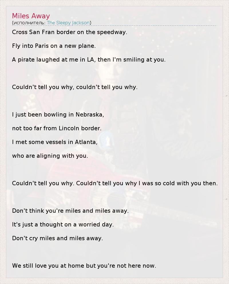 Cross San Fran border on the speedway. Fly into Paris on a new plane. A pirate laughed at me in LA, then I'm smiling at you. Couldn't tell you why, couldn't tell you why. I just been bowling in Nebraska, not too far from Lincoln border. I met some vessels in Atlanta, who are aligning with you. Couldn't tell you why. Couldn't tell you why I was so cold with you then. Don't think you're miles and miles away. It's just a thought on a worried day. Don't cry miles and miles away. We still love you at home but you're not here now.