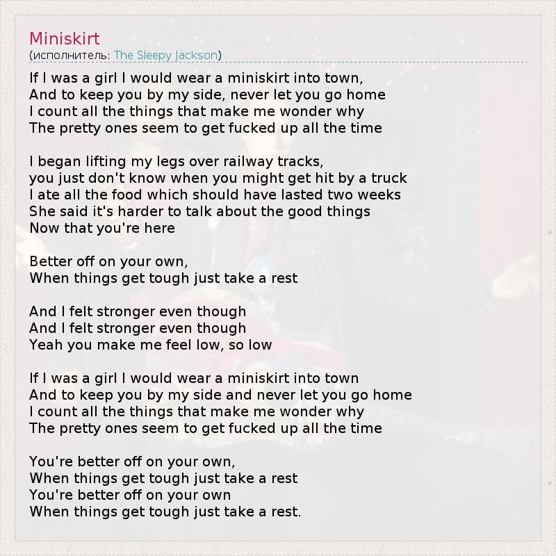 If I was a girl I would wear a miniskirt into town, And to keep you by my side, never let you go home I count all the things that make me wonder why The pretty ones seem to get fucked up all the time I began lifting my legs over railway tracks, you just don't know when you might get hit by a truck I ate all the food which should have lasted two weeks She said it's harder to talk about the good things Now that you're here Better off on your own, When things get tough just take a rest And I felt stronger even though And I felt stronger even though Yeah you make me feel low, so low If I was a girl I would wear a miniskirt into town And to keep you by my side and never let you go home I count all the things that make me wonder why The pretty ones seem to get fucked up all the time You're better off on your own, When things get tough just take a rest You're better off on your own When things get tough just take a rest.