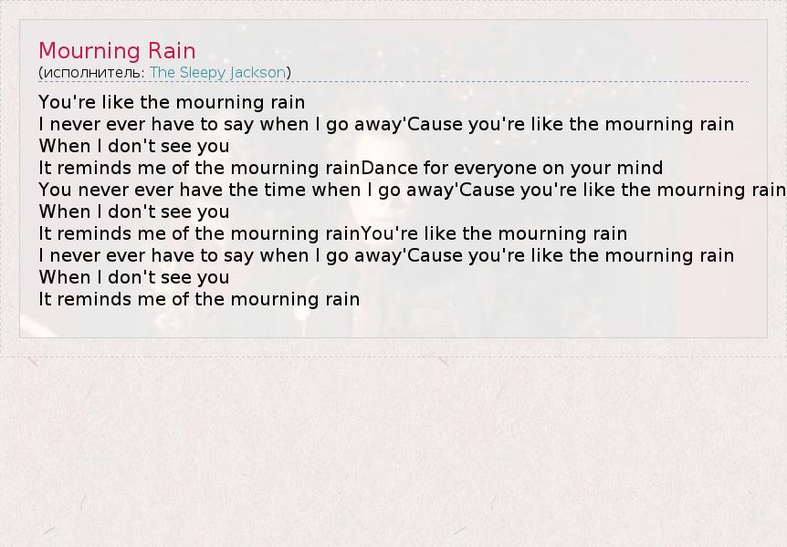 You're like the mourning rain I never ever have to say when I go away'Cause you're like the mourning rain When I don't see you It reminds me of the mourning rainDance for everyone on your mind You never ever have the time when I go away'Cause you're like the mourning rain When I don't see you It reminds me of the mourning rainYou're like the mourning rain I never ever have to say when I go away'Cause you're like the mourning rain When I don't see you It reminds me of the mourning rain