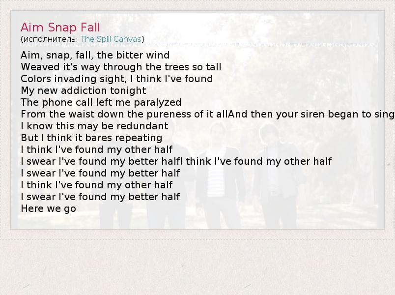 Aim, snap, fall, the bitter wind Weaved it's way through the trees so tall Colors invading sight, I think I've found My new addiction tonight The phone call left me paralyzed From the waist down the pureness of it allAnd then your siren began to sing I know this may be redundant But I think it bares repeating I think I've found my other half I swear I've found my better halfI think I've found my other half I swear I've found my better half I think I've found my other half I swear I've found my better half Here we go