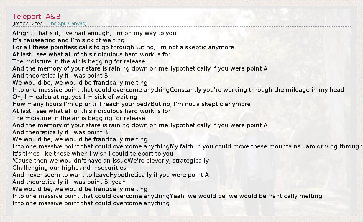 Alright, that's it, I've had enough, I'm on my way to you It's nauseating and I'm sick of waiting For all these pointless calls to go throughBut no, I'm not a skeptic anymore At last I see what all of this ridiculous hard work is for The moisture in the air is begging for release And the memory of your stare is raining down on meHypothetically if you were point A And theoretically if I was point B We would be, we would be frantically melting Into one massive point that could overcome anythingConstantly you're working through the mileage in my head Oh, I'm calculating, yes I'm sick of waiting How many hours I'm up until I reach your bed?But no, I'm not a skeptic anymore At last I see what all of this ridiculous hard work is for The moisture in the air is begging for release And the memory of your stare is raining down on meHypothetically if you were point A And theoretically if I was point B We would be, we would be frantically melting Into one massive point that could overcome anythingMy faith in you could move these mountains I am driving through It's times like these when I wish I could teleport to you 'Cause then we wouldn't have an issueWe're cleverly, strategically Challenging our fright and insecurities And never seem to want to leaveHypothetically if you were point A And theoretically if I was point B, yeah We would be, we would be frantically melting Into one massive point that could overcome anythingYeah, we would be, we would be frantically melting Into one massive point that could overcome anything