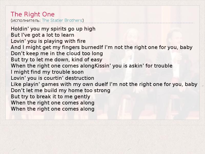 Это интересно:The Statler Brothers - это американский музыкальный квартет, основанный в 1955 г., в городе Стонтон, штат Вирджиния (США).Statler Brothers изначально исполняли госпел в местных церквях. Несмотря на название группы, только два члена The Statler Brothers (Дон и Гарольд Рид) настоящие братья. Ни у одного из остальных нет фамилии "Statler". <<<<<<< History >>>>>>>Когда у группы еще не было названия,... продолжение