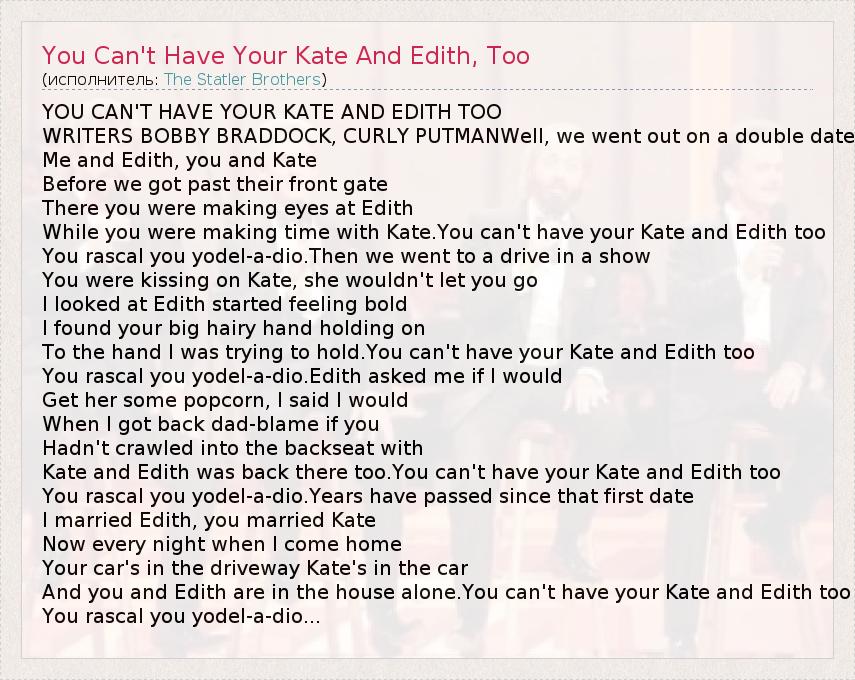 ГлавнаяИсполнителиThe Statler BrothersYou Can't Have Your Kate And Edith, Too