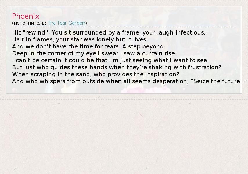 Hit "rewind". You sit surrounded by a frame, your laugh infectious. Hair in flames, your star was lonely but it lives. And we don't have the time for tears. A step beyond. Deep in the corner of my eye I swear I saw a curtain rise. I can't be certain it could be that I'm just seeing what I want to see. But just who guides these hands when they're shaking with frustration? When scraping in the sand, who provides the inspiration? And who whispers from outside when all seems desperation, "Seize the future..."