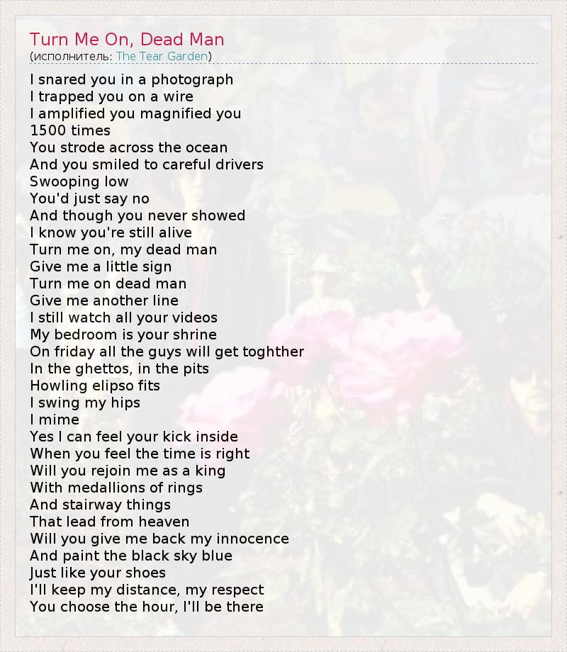 I snared you in a photograph I trapped you on a wire I amplified you magnified you 1500 times You strode across the ocean And you smiled to careful drivers Swooping low You'd just say no And though you never showed I know you're still alive Turn me on, my dead man Give me a little sign Turn me on dead man Give me another line I still watch all your videos My bedroom is your shrine On friday all the guys will get toghther In the ghettos, in the pits Howling elipso fits I swing my hips I mime Yes I can feel your kick inside When you feel the time is right Will you rejoin me as a king With medallions of rings And stairway things That lead from heaven Will you give me back my innocence And paint the black sky blue Just like your shoes I'll keep my distance, my respect You choose the hour, I'll be there