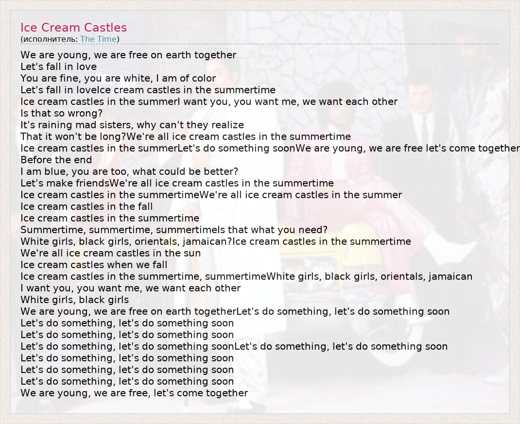 We are young, we are free on earth together Let's fall in love You are fine, you are white, I am of color Let's fall in loveIce cream castles in the summertime Ice cream castles in the summerI want you, you want me, we want each other Is that so wrong? It's raining mad sisters, why can't they realize That it won't be long?We're all ice cream castles in the summertime Ice cream castles in the summerLet's do something soonWe are young, we are free let's come together Before the end I am blue, you are too, what could be better? Let's make friendsWe're all ice cream castles in the summertime Ice cream castles in the summertimeWe're all ice cream castles in the summer Ice cream castles in the fall Ice cream castles in the summertime Summertime, summertime, summertimeIs that what you need? White girls, black girls, orientals, jamaican?Ice cream castles in the summertime We're all ice cream castles in the sun Ice cream castles when we fall Ice cream castles in the summertime, summertimeWhite girls, black girls, orientals, jamaican I want you, you want me, we want each other White girls, black girls We are young, we are free on earth togetherLet's do something, let's do something soon Let's do something, let's do something soon Let's do something, let's do something soon Let's do something, let's do something soonLet's do something, let's do something soon Let's do something, let's do something soon Let's do something, let's do something soon Let's do something, let's do something soon We are young, we are free, let's come together