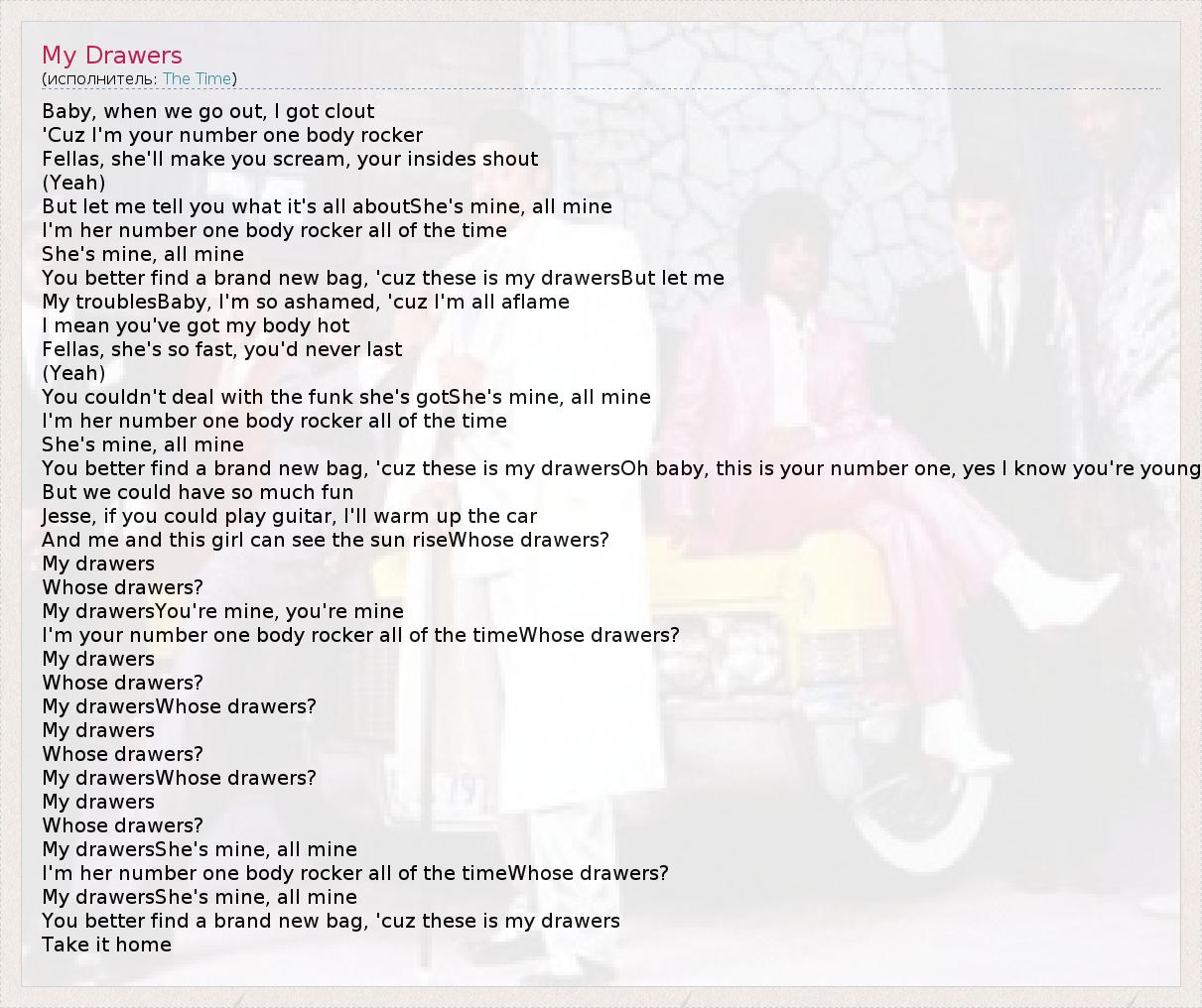 Baby, when we go out, I got clout 'Cuz I'm your number one body rocker Fellas, she'll make you scream, your insides shout (Yeah) But let me tell you what it's all aboutShe's mine, all mine I'm her number one body rocker all of the time She's mine, all mine You better find a brand new bag, 'cuz these is my drawersBut let me My troublesBaby, I'm so ashamed, 'cuz I'm all aflame I mean you've got my body hot Fellas, she's so fast, you'd never last (Yeah) You couldn't deal with the funk she's gotShe's mine, all mine I'm her number one body rocker all of the time She's mine, all mine You better find a brand new bag, 'cuz these is my drawersOh baby, this is your number one, yes I know you're young But we could have so much fun Jesse, if you could play guitar, I'll warm up the car And me and this girl can see the sun riseWhose drawers? My drawers Whose drawers? My drawersYou're mine, you're mine I'm your number one body rocker all of the timeWhose drawers? My drawers Whose drawers? My drawersWhose drawers? My drawers Whose drawers? My drawersWhose drawers? My drawers Whose drawers? My drawersShe's mine, all mine I'm her number one body rocker all of the timeWhose drawers? My drawersShe's mine, all mine You better find a brand new bag, 'cuz these is my drawers Take it home