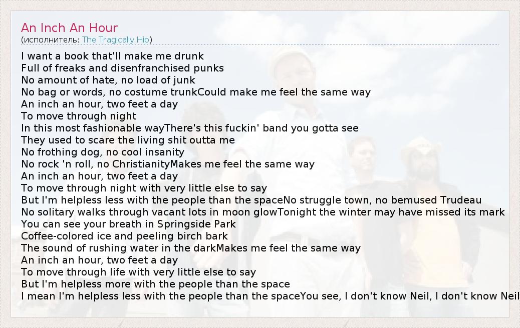 А как ты думаешь, о чем песня "An Inch An Hour" ?