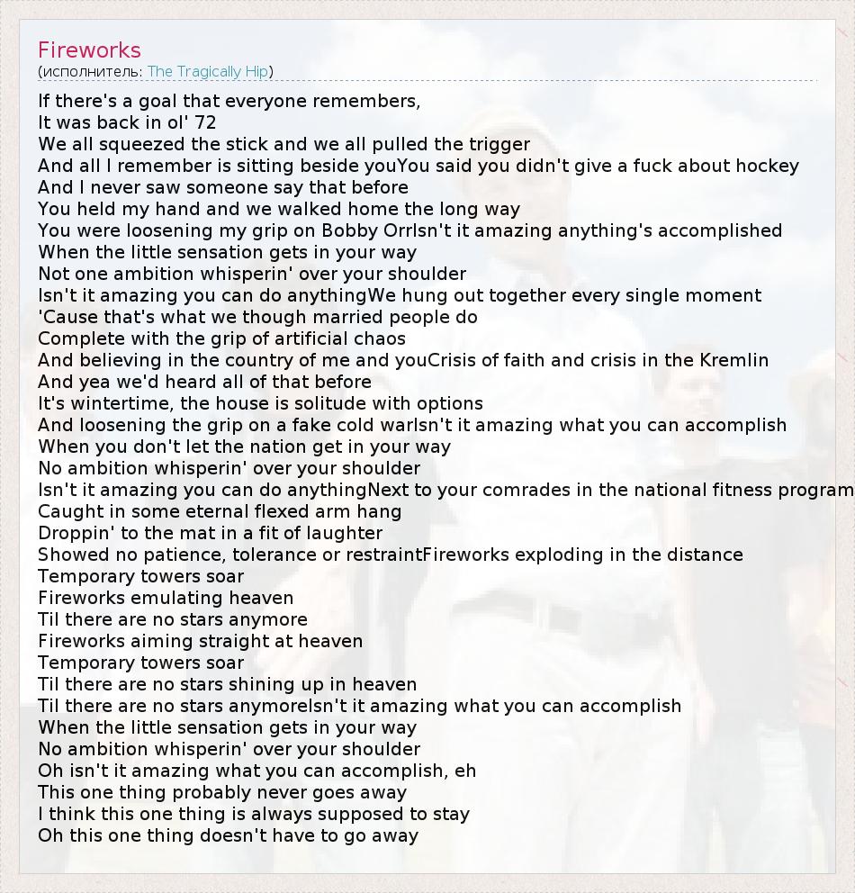 If there's a goal that everyone remembers, It was back in ol' 72 We all squeezed the stick and we all pulled the trigger And all I remember is sitting beside youYou said you didn't give a fuck about hockey And I never saw someone say that before You held my hand and we walked home the long way You were loosening my grip on Bobby OrrIsn't it amazing anything's accomplished When the little sensation gets in your way Not one ambition whisperin' over your shoulder Isn't it amazing you can do anythingWe hung out together every single moment 'Cause that's what we though married people do Complete with the grip of artificial chaos And believing in the country of me and youCrisis of faith and crisis in the Kremlin And yea we'd heard all of that before It's wintertime, the house is solitude with options And loosening the grip on a fake cold warIsn't it amazing what you can accomplish When you don't let the nation get in your way No ambition whisperin' over your shoulder Isn't it amazing you can do anythingNext to your comrades in the national fitness program Caught in some eternal flexed arm hang Droppin' to the mat in a fit of laughter Showed no patience, tolerance or restraintFireworks exploding in the distance Temporary towers soar Fireworks emulating heaven Til there are no stars anymore Fireworks aiming straight at heaven Temporary towers soar Til there are no stars shining up in heaven Til there are no stars anymoreIsn't it amazing what you can accomplish When the little sensation gets in your way No ambition whisperin' over your shoulder Oh isn't it amazing what you can accomplish, eh This one thing probably never goes away I think this one thing is always supposed to stay Oh this one thing doesn't have to go away