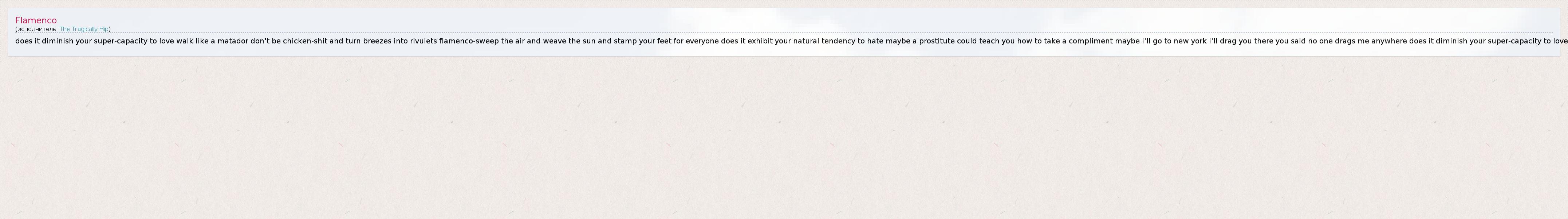does it diminish your super-capacity to love walk like a matador don't be chicken-shit and turn breezes into rivulets flamenco-sweep the air and weave the sun and stamp your feet for everyone does it exhibit your natural tendency to hate maybe a prostitute could teach you how to take a compliment maybe i'll go to new york i'll drag you there you said no one drags me anywhere does it diminish your super-capacity to love