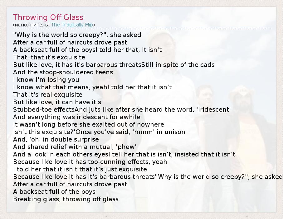 А как ты думаешь, о чем песня "Throwing Off Glass" ?