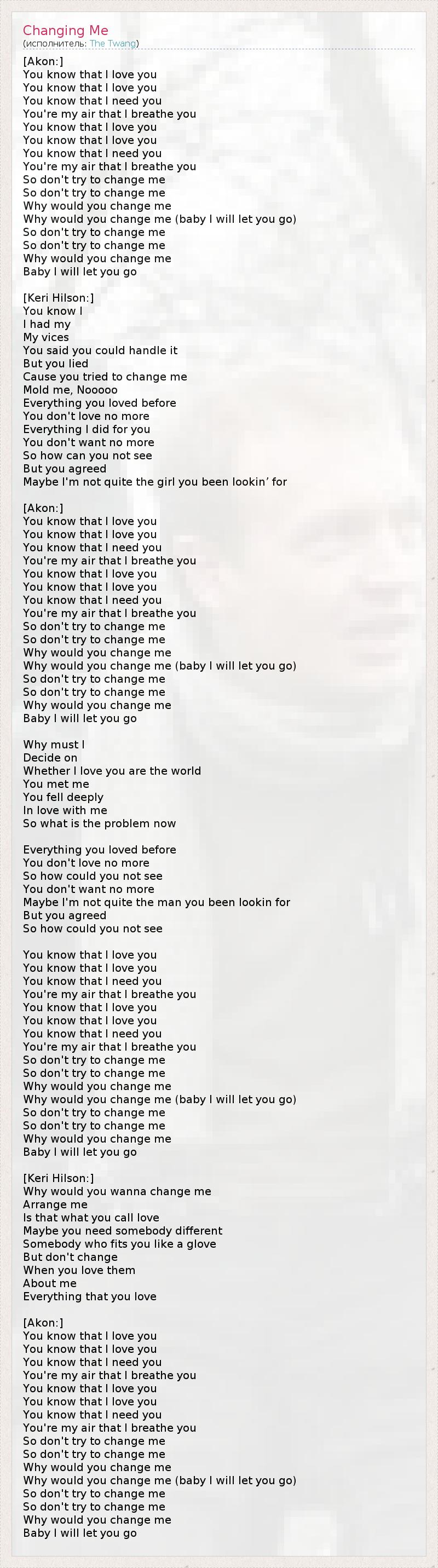 [Akon:] Ты знаешь, что я люблю тебя, Ты знаешь, что я люблю тебя, Ты знаешь, что ты мне нужна. Ты мой воздух, которым я дышу. Ты знаешь, что я люблю тебя, Ты знаешь, что я люблю тебя, Ты знаешь, что ты мне нужна. Ты мой воздух, которым я дышу. Так не пытайся изменить меня, Не пытайся изменить меня. Почему ты меня изменила бы? Почему ты меня изменила бы? (детка, я отпущу тебя) Так не пытайся изменить меня, Не пытайся изменить меня. Почему ты меня изменила бы? Детка, я отпущу тебя. [Keri Hilson:] Ты знаешь, у меня У меня были Свои недостатки. Ты сказал, что не можешь стерпеть это, Но ты лгал, Потому что ты пытался изменить меня, Слепить меня заново - нееет! Все, что ты любил раньше, Больше не любишь. Все, что я делала для тебя, Ты больше этого не хочешь. Так как ты этого не видишь? Но ты согласился. Наверно, я не совсем та девушка, которую ты ищешь... [Akon:] Ты знаешь, что я люблю тебя, Ты знаешь, что я люблю тебя, Ты знаешь, что ты мне нужна. Ты мой воздух, которым я дышу. Ты знаешь, что я люблю тебя, Ты знаешь, что я люблю тебя, Ты знаешь, что ты мне нужна. Ты мой воздух, которым я дышу. Так не пытайся изменить меня, Не пытайся изменить меня. Почему ты меня изменила бы? Почему ты меня изменила бы? (детка, я отпущу тебя) Так не пытайся изменить меня, Не пытайся изменить меня. Почему ты меня изменила бы? Детка, я отпущу тебя. Почему я должен Определить, Люблю ли я? Ты - целый мир для меня Ты встретила меня Ты была сильно Влюблена в меня, Так в чем же проблема сейчас? Все, что ты любила, Ты больше не любишь. Все, что я делал для тебя, Ты больше не хочешь. Наверно, я не совсем тот мужчина, которого ты ищешь, Но ты согласилась. Так как же ты не видела? Ты знаешь, что я люблю тебя, Ты знаешь, что я люблю тебя, Ты знаешь, что ты мне нужна. Ты мой воздух, которым я дышу. Ты знаешь, что я люблю тебя, Ты знаешь, что я люблю тебя, Ты знаешь, что ты мне нужна. Ты мой воздух, которым я дышу. Так не пытайся изменить меня, Не пытайся изменить меня. Почему ты меня изменила бы? Почему ты меня изменила бы? (детка, я отпущу тебя) Так не пытайся изменить меня, Не пытайся изменить меня. Почему ты меня изменила бы? Детка, я отпущу тебя. [Keri Hilson:] Почему ты хочешь изменить меня, Подстроить под себя? И это ты называешь любовью? Наверно, тебе нужен кто-то другой, Кто-то, кто подойдёт именно тебе. Но не изменяй Все, что ты любишь Во мне, Если ты любишь это... [Akon:] Ты знаешь, что я люблю тебя, Ты знаешь, что я люблю тебя, Ты знаешь, что ты мне нужна. Ты мой воздух, которым я дышу. Ты знаешь, что я люблю тебя, Ты знаешь, что я люблю тебя, Ты знаешь, что ты мне нужна. Ты мой воздух, которым я дышу. Так не пытайся изменить меня, Не пытайся изменить меня. Почему ты меня изменила бы? Почему ты меня изменила бы? (детка, я отпущу тебя) Так не пытайся изменить меня, Не пытайся изменить меня. Почему ты меня изменила бы? Детка, я отпущу тебя.