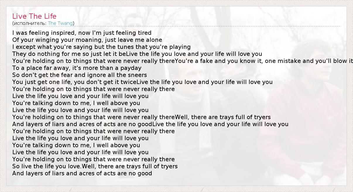 I was feeling inspired, now I'm just feeling tired Of your winging your moaning, just leave me alone I except what you're saying but the tunes that you're playing They do nothing for me so just let it beLive the life you love and your life will love you You're holding on to things that were never really thereYou're a fake and you know it, one mistake and you'll blow it To a place far away, it's more than a payday So don't get the fear and ignore all the sneers You just get one life, you don't get it twiceLive the life you love and your life will love you You're holding on to things that were never really there Live the life you love and your life will love you You're talking down to me, I well above you Live the life you love and your life will love you You're holding on to things that were never really thereWell, there are trays full of tryers And layers of liars and acres of acts are no goodLive the life you love and your life will love you You're holding on to things that were never really there Live the life you love and your life will love you You're talking down to me, I well above you Live the life you love and your life will love you You're holding on to things that were never really there So live the life you love.Well, there are trays full of tryers And layers of liars and acres of acts are no good