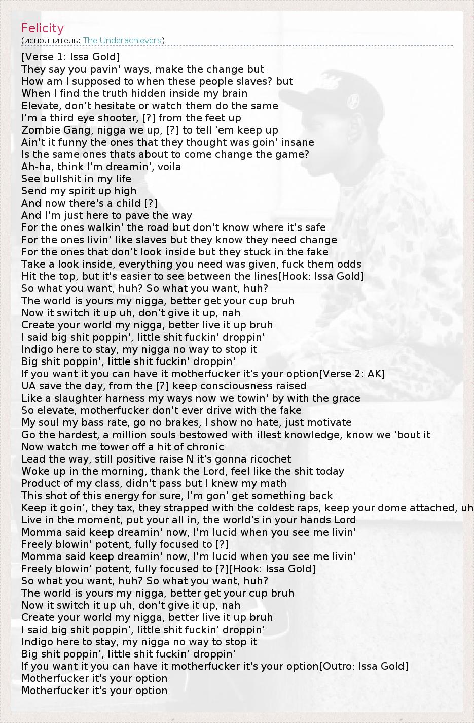 [Verse 1: Issa Gold] They say you pavin' ways, make the change but How am I supposed to when these people slaves? but When I find the truth hidden inside my brain Elevate, don't hesitate or watch them do the same I'm a third eye shooter, [?] from the feet up Zombie Gang, nigga we up, [?] to tell 'em keep up Ain't it funny the ones that they thought was goin' insane Is the same ones thats about to come change the game? Ah-ha, think I'm dreamin', voila See bullshit in my life Send my spirit up high And now there's a child [?] And I'm just here to pave the way For the ones walkin' the road but don't know where it's safe For the ones livin' like slaves but they know they need change For the ones that don't look inside but they stuck in the fake Take a look inside, everything you need was given, fuck them odds Hit the top, but it's easier to see between the lines[Hook: Issa Gold] So what you want, huh? So what you want, huh? The world is yours my nigga, better get your cup bruh Now it switch it up uh, don't give it up, nah Create your world my nigga, better live it up bruh I said big shit poppin', little shit fuckin' droppin' Indigo here to stay, my nigga no way to stop it Big shit poppin', little shit fuckin' droppin' If you want it you can have it motherfucker it's your option[Verse 2: AK] UA save the day, from the [?] keep consciousness raised Like a slaughter harness my ways now we towin' by with the grace So elevate, motherfucker don't ever drive with the fake My soul my bass rate, go no brakes, I show no hate, just motivate Go the hardest, a million souls bestowed with illest knowledge, know we 'bout it Now watch me tower off a hit of chronic Lead the way, still positive raise N it's gonna ricochet Woke up in the morning, thank the Lord, feel like the shit today Product of my class, didn't pass but I knew my math This shot of this energy for sure, I'm gon' get something back Keep it goin', they tax, they strapped with the coldest raps, keep your dome attached, uh Live in the moment, put your all in, the world's in your hands Lord Momma said keep dreamin' now, I'm lucid when you see me livin' Freely blowin' potent, fully focused to [?] Momma said keep dreamin' now, I'm lucid when you see me livin' Freely blowin' potent, fully focused to [?][Hook: Issa Gold] So what you want, huh? So what you want, huh? The world is yours my nigga, better get your cup bruh Now it switch it up uh, don't give it up, nah Create your world my nigga, better live it up bruh I said big shit poppin', little shit fuckin' droppin' Indigo here to stay, my nigga no way to stop it Big shit poppin', little shit fuckin' droppin' If you want it you can have it motherfucker it's your option[Outro: Issa Gold] Motherfucker it's your option Motherfucker it's your option