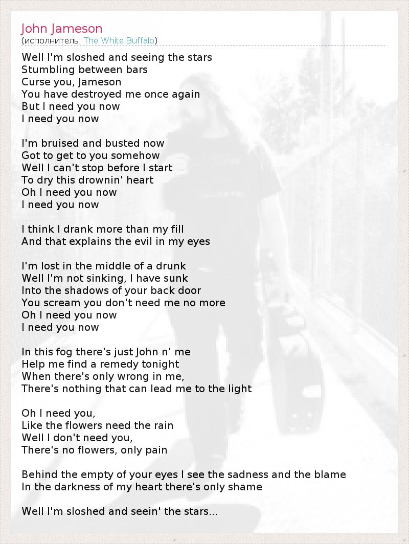 Well I'm sloshed and seeing the stars Stumbling between bars Curse you, Jameson You have destroyed me once again But I need you now I need you now I'm bruised and busted now Got to get to you somehow Well I can't stop before I start To dry this drownin' heart Oh I need you now I need you now I think I drank more than my fill And that explains the evil in my eyes I'm lost in the middle of a drunk Well I'm not sinking, I have sunk Into the shadows of your back door You scream you don't need me no more Oh I need you now I need you now In this fog there's just John n' me Help me find a remedy tonight When there's only wrong in me, There's nothing that can lead me to the light Oh I need you, Like the flowers need the rain Well I don't need you, There's no flowers, only pain Behind the empty of your eyes I see the sadness and the blame In the darkness of my heart there's only shame Well I'm sloshed and seein' the stars...