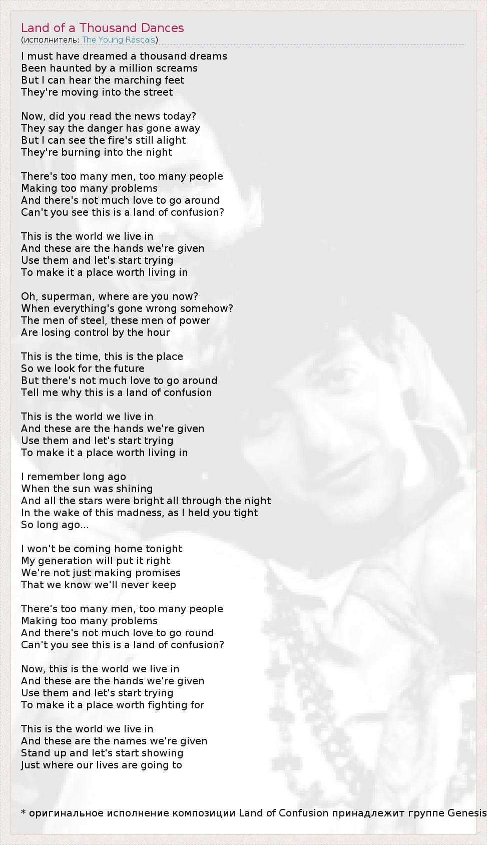 А как ты думаешь, о чем песня "Land of a Thousand Dances" ?