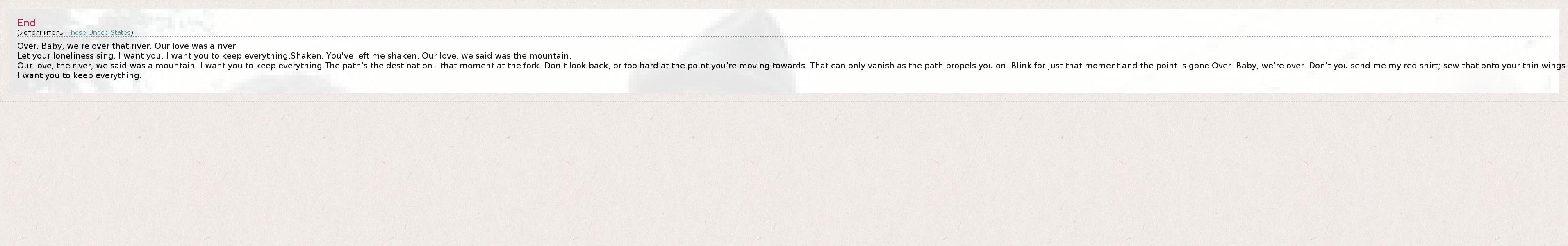 Over. Baby, we're over that river. Our love was a river. Let your loneliness sing. I want you. I want you to keep everything.Shaken. You've left me shaken. Our love, we said was the mountain. Our love, the river, we said was a mountain. I want you to keep everything.The path's the destination - that moment at the fork. Don't look back, or too hard at the point you're moving towards. That can only vanish as the path propels you on. Blink for just that moment and the point is gone.Over. Baby, we're over. Don't you send me my red shirt; sew that onto your thin wings. I want you to keep everything.