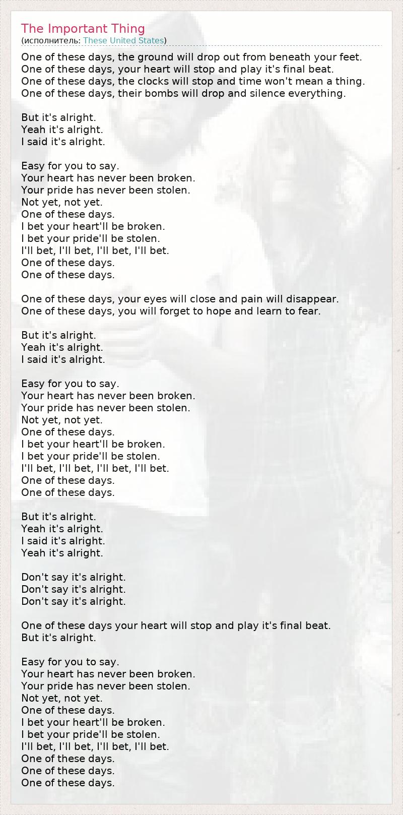 В один из этих дней земля уйдёт из-под ног. В один из этих дней твоё сердце остановится и сыграет последний аккорд. В один из этих дней часы остановятся, и время перестанет что-то значить. В один из этих дней их бомбы упадут и заставят всё замолчать. Но все в порядке. Да, все в порядке. Я сказал, что все в порядке. Тебе легко говорить, Твоё сердце никогда не было разбито, Твоя гордость никогда не была украдена. Пока нет, еще нет. В один из этих дней. Держу пари, твоё сердце будет разбито, Держу пари, твоя гордость будет украдена, Я уверен, я уверен, я уверен, я уверен, В один из этих дней, В один из этих дней. В один из этих дней твои глаза закроются, и боль исчезнет. В один из этих дней ты забудешь надежду и познаешь страх. Но все в порядке. Да, все в порядке. Я сказал, что все в порядке. Тебе легко говорить, Твоё сердце никогда не было разбито, Твоя гордость никогда не была украдена. Пока нет, еще нет. В один из этих дней. Держу пари, твоё сердце будет разбито, Держу пари, твоя гордость будет украдена, Я уверен, я уверен, я уверен, я уверен, В один из этих дней, В один из этих дней. Но все в порядке. Да, все в порядке. Я сказал, что все в порядке. Да, все в порядке. Не говори, что все в порядке. Не говори, что все в порядке. Не говори, что все в порядке. В один из этих дней твоё сердце остановится и сыграет последний аккорд, Но все в порядке. Тебе легко говорить, Твоё сердце никогда не было разбито, Твоя гордость никогда не была украдена. Пока нет, еще нет. В один из этих дней. Держу пари, твоё сердце будет разбито, Держу пари, твоя гордость будет украдена, Я уверен, я уверен, я уверен, я уверен, В один из этих дней, В один из этих дней, В один из этих дней.